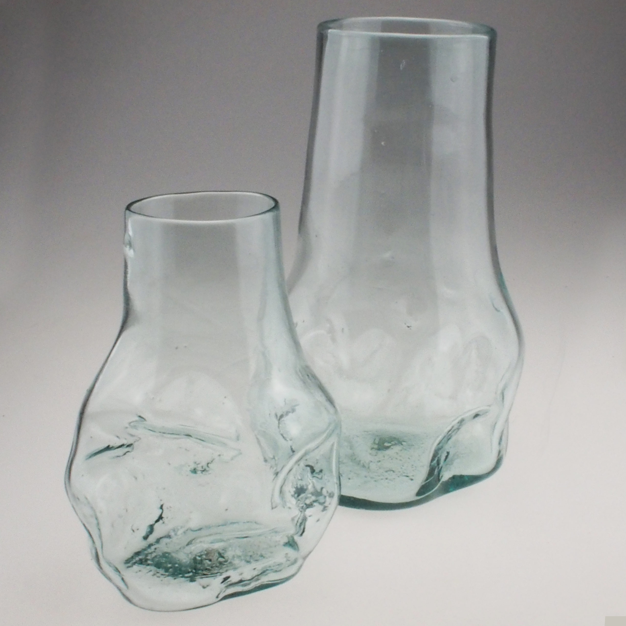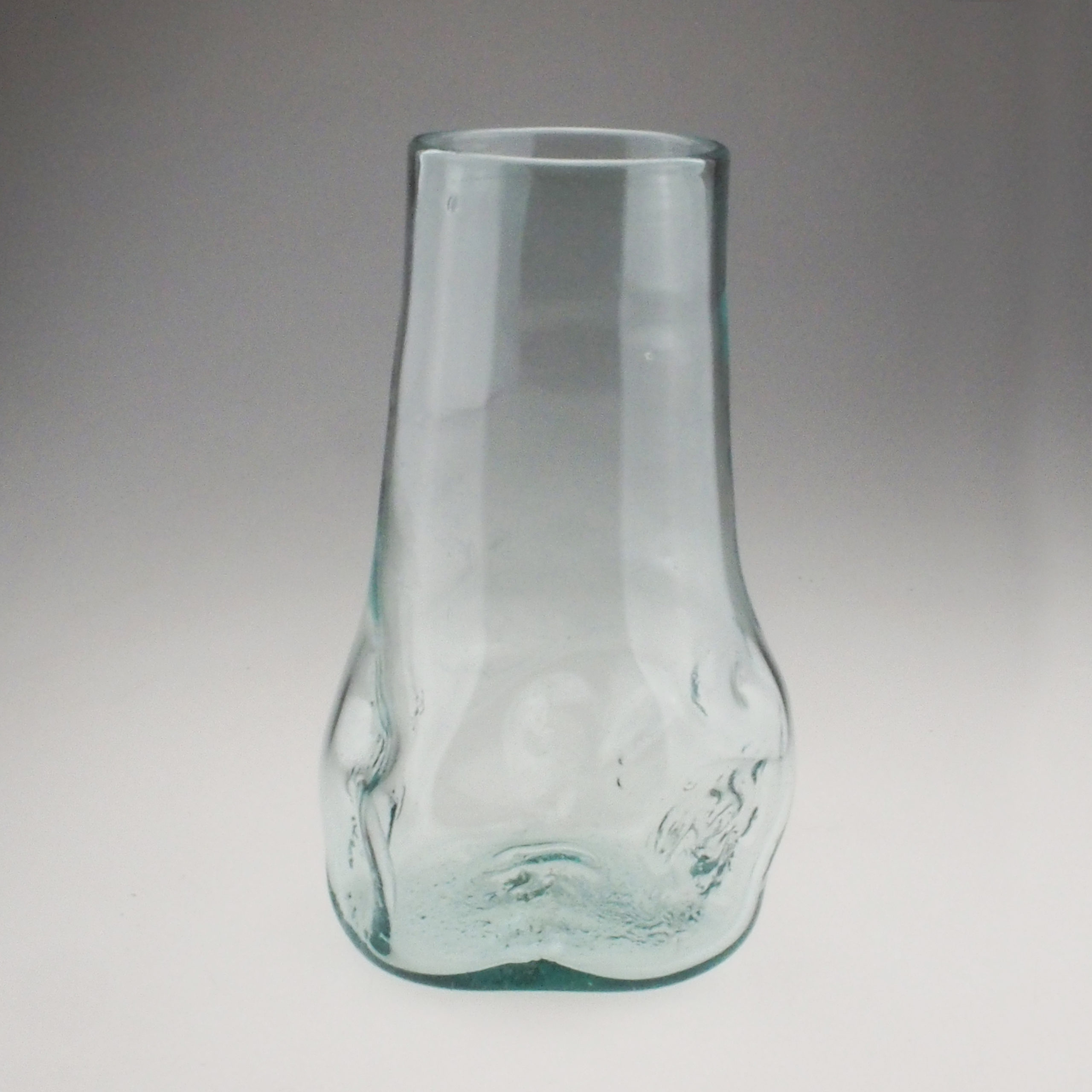 Vase soufflé en verre 100% recyclé. La partie basse est soufflée-moullée dans de petits blocs de grés des Vosges. Chaque vase possède une forme unique.